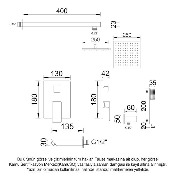 Fause Ankastre Duş Başlığı Borusu Kare Gold KDB103-G